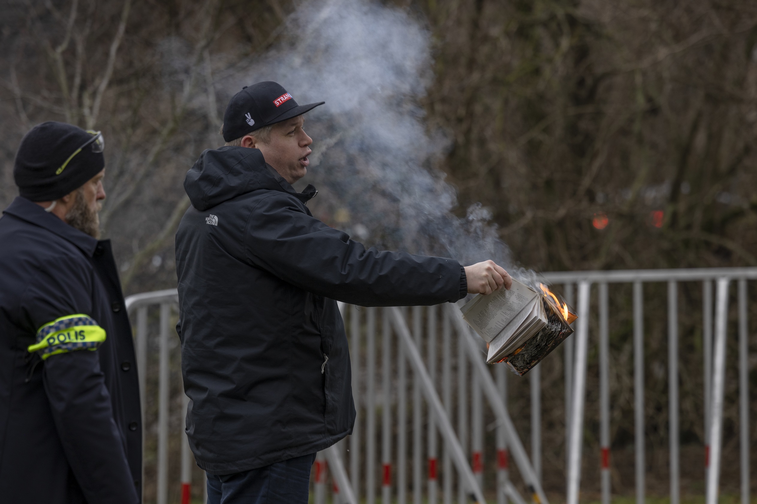 Rasmus Paludan verbrandt een koran bij de Turkse ambassade in Stockholm, 21 januari 2023.