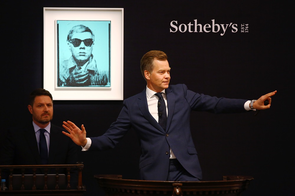 Veilingmeester van Sotheby’s verkoopt een zelfportret van Andy Warhol, 28 juni 2017.