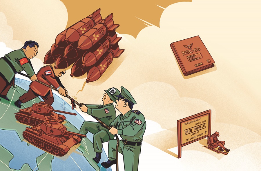 Dergelijke overwegingen werden gestimuleerd door een extreem alarmistisch document van de Policy Planning Staff, dat op 7 april 1950 aan president Truman was gepresenteerd. In memo NSC68 werd beweerd dat de VS in dodelijk gevaar verkeerden vanwege de plannen van de Sovjet-Unie en dat zij er verstandig aan zouden doen hun militaire uitgaven te verdrievoudigen. Volgens sommige historici was dit ‘the most important American policy statement of the Cold War’. Hierover later meer.