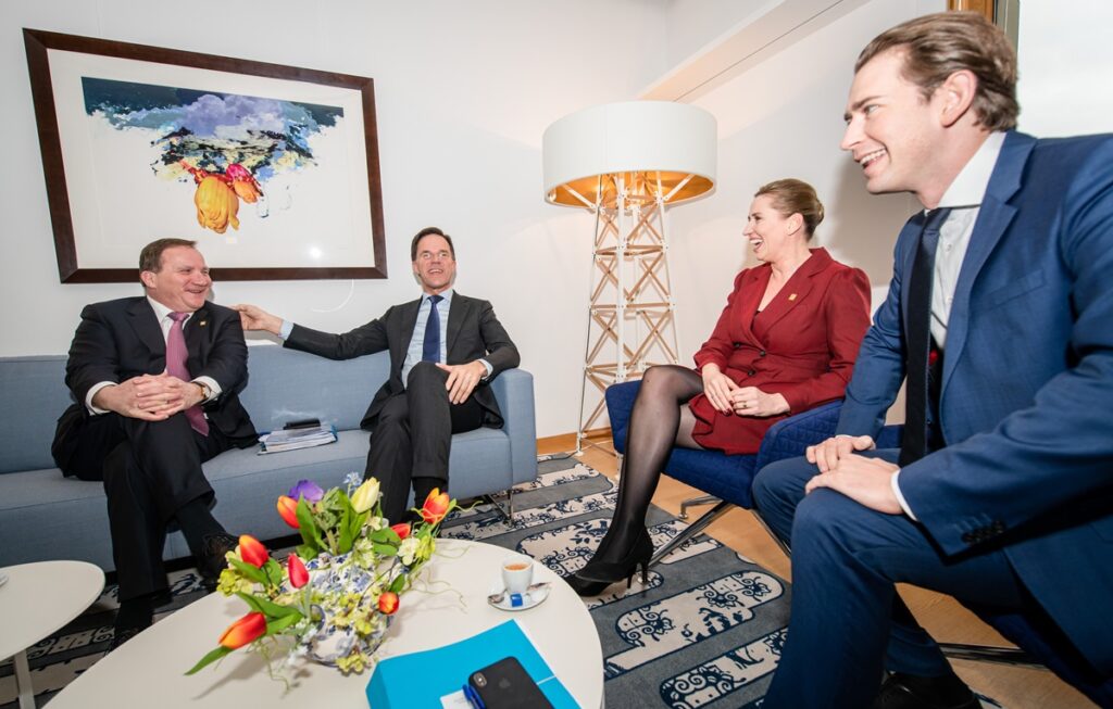 Premier Rutte met zijn collega’s van de andere ‘Vrekkige Vier’ – Zweden, Denemarken en Oostenrijk – op de Europese top over de meerjarenbegroting. Brussel, 20 februari 2020.