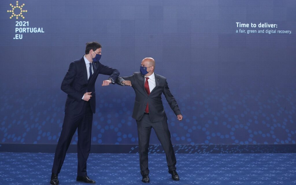 De Portugese minister João Leão (r) begroet Wopke Hoekstra in Lissabon, 21 maart 2021.